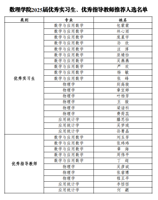 根据公司《关于开展2025届毕业实习工作总结、成绩评定和评优工作的通知》精神和要求,经各专业初评、公司审定,拟推荐包蒙蒙等19名同学为优秀实习生,刘玉芳等10位教师为优秀实习指导教师,具体推荐人选名单如下:
