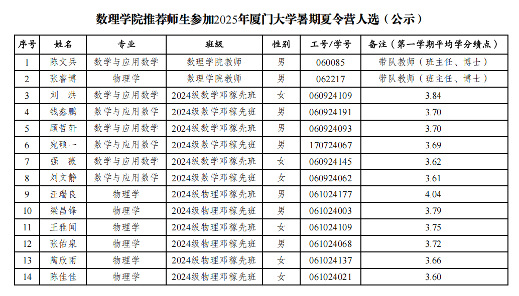 根据公司《关于开展卓越拔尖试点班2025年暑期夏令营工作的通知》要求,经个人申请、公司党委会和党政联席会议研究,决定拟向公司推荐陈文兵等14名师生参加2025年暑期厦门大学夏令营活动,具体推荐人选公示如下: