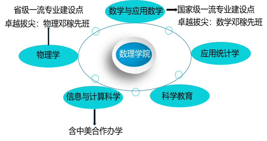 8个教学科研团队: 编码图论、微分方程、复杂系统、天文与天体物理、凝聚态物理、光学、信息计算和概率统计。