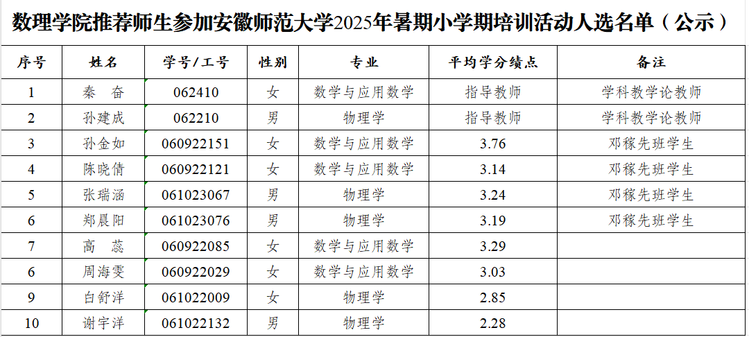 根据公司《关于选派师范生参加安徽师范大学2025年暑期小学期培训活动的通知》要求,经个人申请、公司研究决定,拟向公司推荐秦奋等10名师生参加安徽师范大学2025年暑期小学期培训活动,具体推荐人选公示如下: