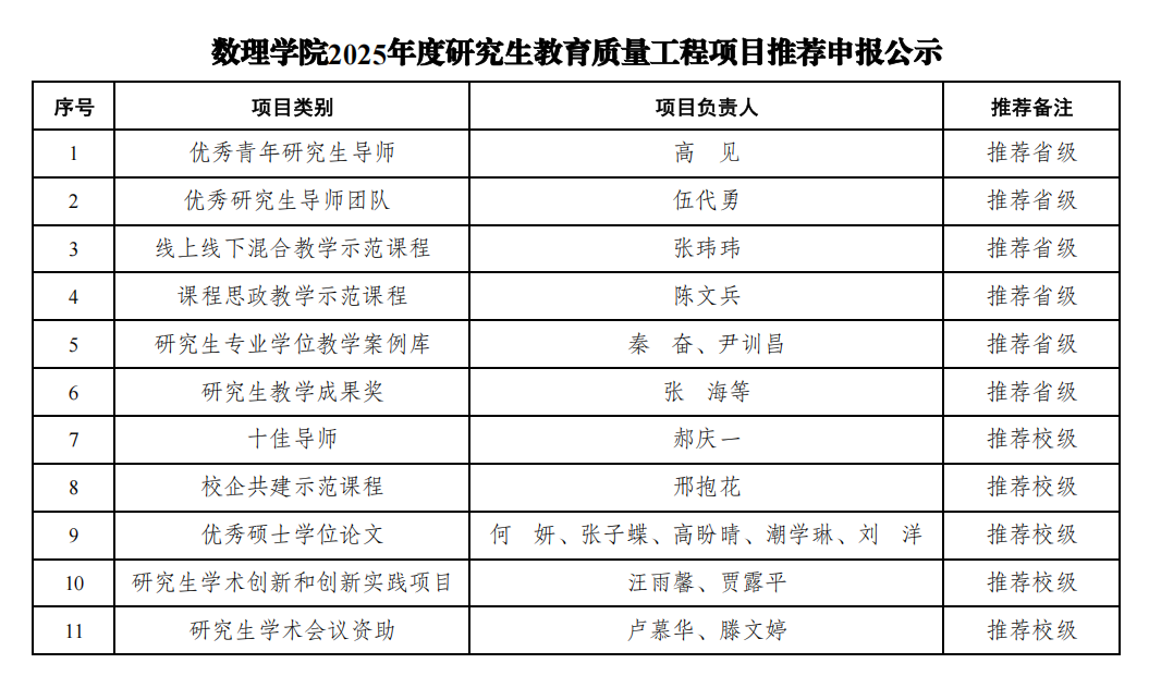 根据公司《关于组织开展2025年度新时代育人质量工程项目(研究生教育)申报工作的通知》精神和要求,经个人申报、公司学位评定委员会评议、公司党政联席会议审定,拟推荐高见等申报2025年度研究生教育质量工程项目,具体推荐结果公示如下: