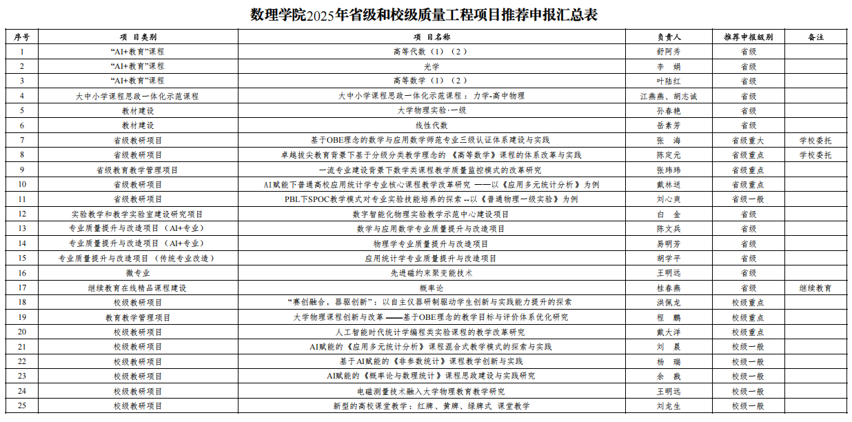 根据公司《关于开展2025年度省级和校级质量工程项目申报工作的通知》要求,经个人申报、公司教学工作委员会评审、公司党政联席会议审定,拟向公司推荐舒阿秀等25位教师分别申报2025年度省级和校级质量工程项目,现将申报推荐结果公示如下: