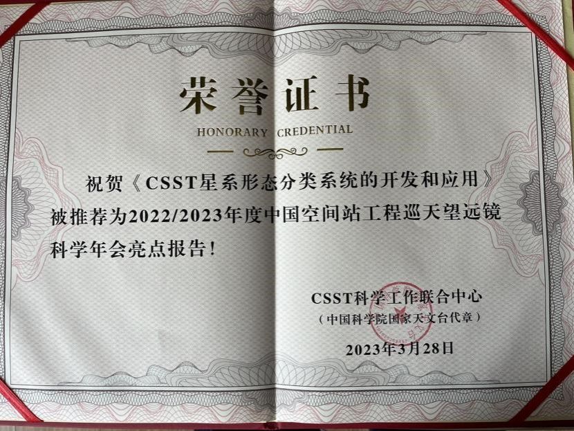3月28日,2022/2023中国空间站工程巡天望远镜科学年会在北京召开。william威廉中文官网方官文研究员的成果《CSST星系形态分类系统的开发和应用》荣获科学年会亮点报告奖,由韩占文院士颁奖。