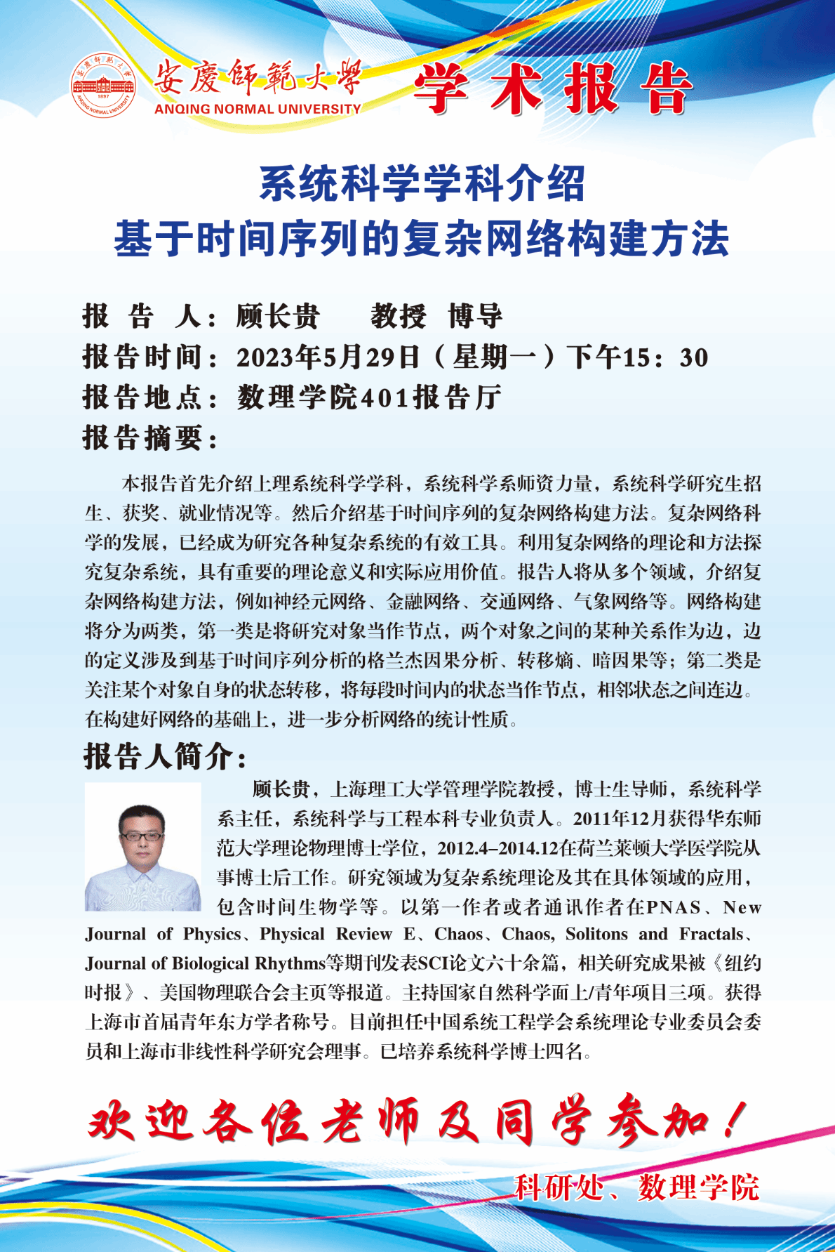 上海理工大学管理公司顾长贵教授应邀作题为“系统科学学科介绍 基于时间序列的复杂网络构建方法”的学术报告预告