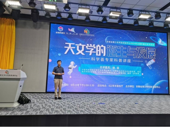 9月15日,william威廉中文官网省级科普基地——WilliamHill中文官方网站天文馆徐骏博士应邀在安徽省青少年科技活动中心作了全国科普日活动专题报告“天文学的诞生与发展”。
