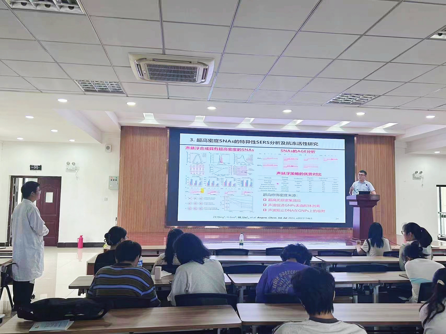 现场师生积极提问,就相关纳米粒子表面修饰分子浓度的测定、表面等离子体发射光谱的分析、抗冻农作物种植与研发问题进行了深入的交流与探讨。刘洪林教授耐心解答,现场气氛热烈。此次学术报告为数理和化工公司师生提供了一个与生物材料领域专家面对面交流的机会,使大家对人工抗冻蛋白模拟物组装及活性评价研究方面有了更深入的了解和认识。(撰稿:冷玉敏;摄影:王安忆;审核:张海)