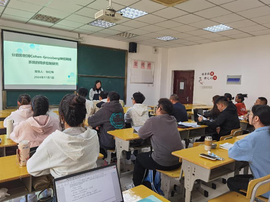 张红梅副教授首先介绍了分数阶时滞Cohen-Grossberg神经网络系统的研究背景和理论基础,分析了时滞在分数阶神经网络同步控制中的作用,以及现有的同步控制方法及其局限性,接着针对分数阶时滞Cohen-Grossberg神经网络系统提出了同步控制策略,并以分数阶模糊时滞Cohen-Grossberg神经网络模型为例,设计自适应控制策略,结合实例仿真说明了研究方法的可行性。报告结束后,张红梅副教授就报告中的部分问题与现场同学进行了互动交流,对大家提出的问题一一作了解答。