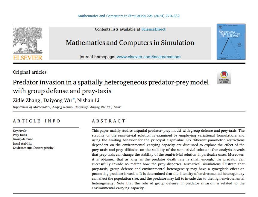 近日,2022级数学学科硕士研究生张子蝶以第一作者和导师团队在国际学术期刊《Mathematics and Computers in Simulation 》发表SCI论文“Predator invasion in a spatially heterogeneous predator-prey model with group defense and prey-taxis”,导师伍代勇教授为该文通讯作者,该期刊影响因子为4.6,JCR一区期刊,中科院二区Top期刊。
