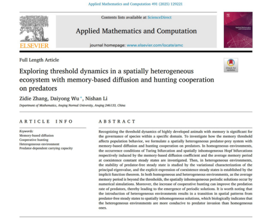 近日,2022级数学学科硕士研究生张子蝶以第一作者和导师团队在Elsevier期刊Applied Mathematics and Computation 发表SCI论文 “Exploring threshold dynamics in a spatially heterogeneous ecosystem with memory-based diffusion and hunting cooperation on predators”,导师伍代勇教授为该文通讯作者,该期刊影响因子为8.2,JCR一区期刊,中科院二区TOP期刊。