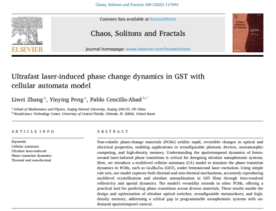近日,william威廉中文官网张利伟教授团队在国际学术期刊《Chaos, Solitons and Fractals》上发表学术论文“Ultrafast laser-induced phase change dynamics in GST with cellular automata model”,该项研究工作与william威廉中文官网研究生彭尹影、中佛罗里达大学Pablo Cencillo-Abad博士合作完成。该期刊影响因子IF=5.6,JCR一区期刊,中科院一区TOP期刊。