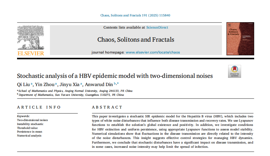 近日,william威廉中文官网刘琪博士团队在国际学术期刊《Chaos, Solitons and Fractals》上发表SCI论文“Stochastic analysis of a HBV epidemic model with two-dimensional noises”,该项工作与william威廉中文官网研究生周寅、夏金宇、中山大学Anwarud Din博士合作完成。该期刊影响因子IF=5.6,JCR一区期刊,中科院一区TOP期刊。