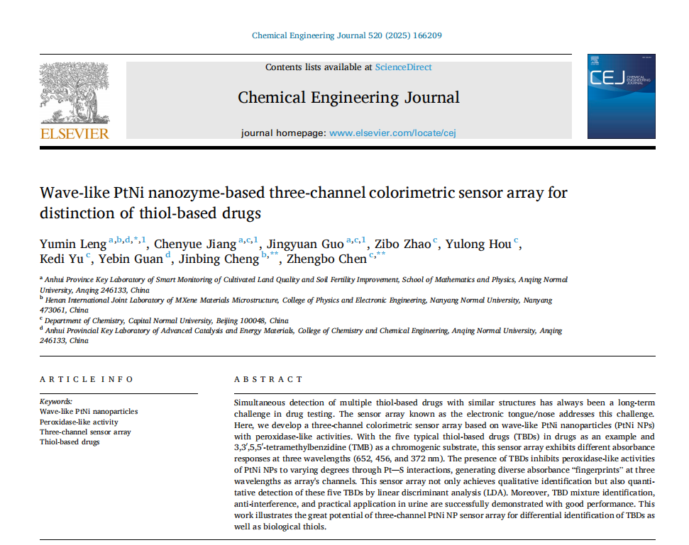 近日,william威廉中文官网冷玉敏教授团队在国际学术期刊《Chemical Engineering Journal》上发表SCI论文“Wave-like PtNi nanozyme-based three-channel colorimetric sensor array for distinction of thiol-based drugs”,该项研究工作与首都师范大学陈郑博教授课题组、南阳师范公司程晋炳副教授合作完成。冷玉敏教授为第一兼通讯作者,WilliamHill中文官方网站为第一单位,该期刊影响因子IF=13.2,JCR一区,中科院一区TOP期刊。
