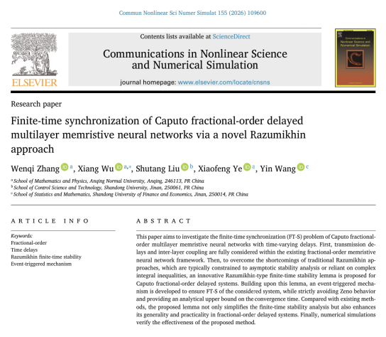 近日,2024级研究生张文琦以第一作者和导师团队在国际学术期刊《Communications in Nonlinear Science and Numerical Simulation》发表论文“Finite-time synchronization of Caputo fractional-order delayed multilayer memristive neural networks via a novel Razumikhin approach”,导师吴祥博士为该论文通讯作者,该期刊影响因子3.8,中科院一区期刊。