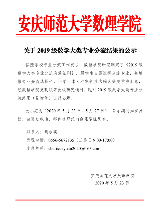 关于2019级数学大类专业分流结果的公示