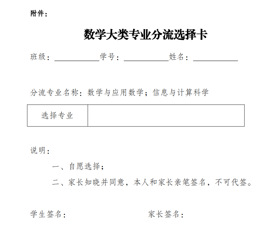 附件:数学大类专业分流选择卡