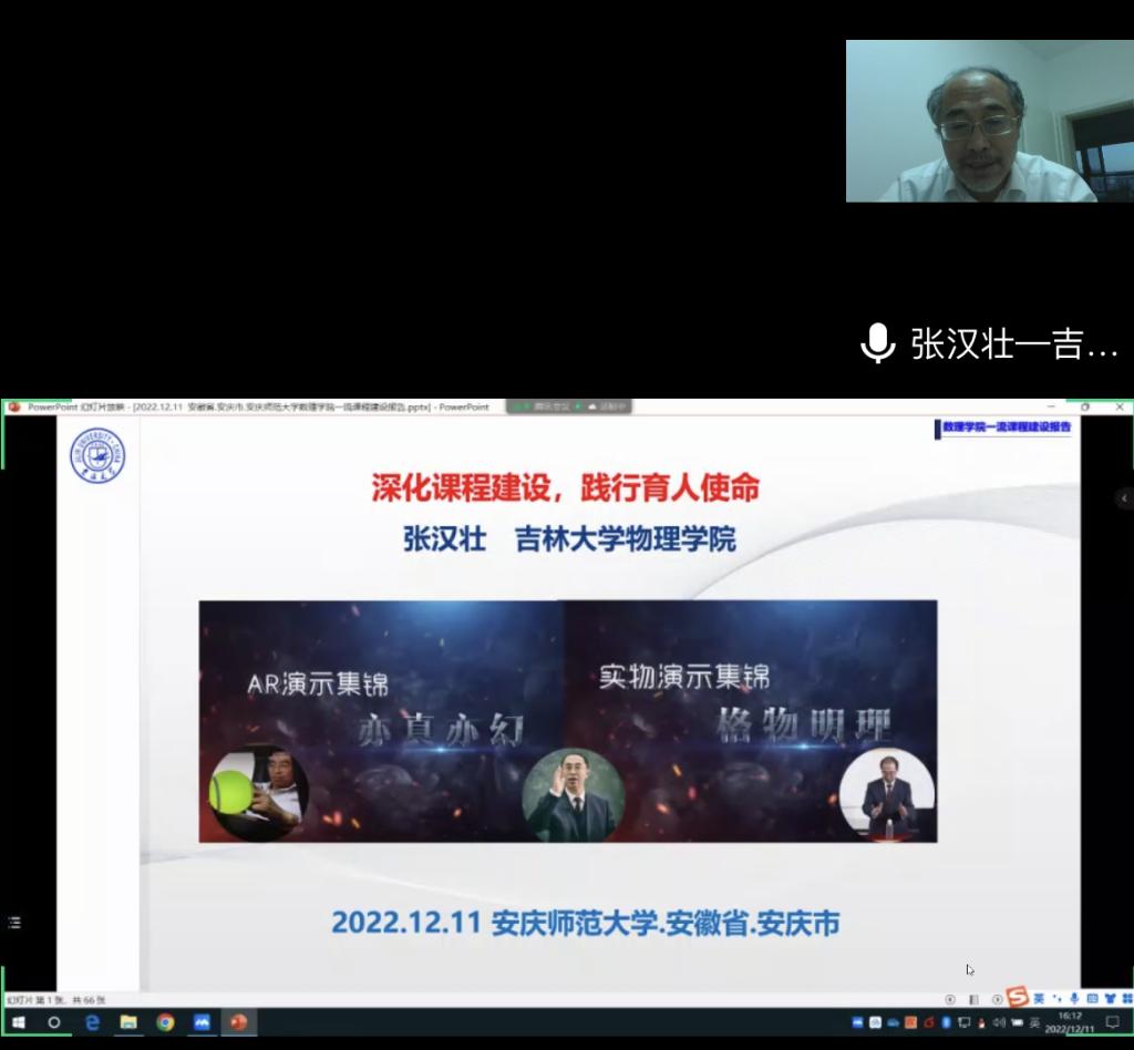 为切实推进物理学一流课程的培育和建设,12月11日下午,公司有幸邀请到国家教学名师、教育部物理学类专业教学指导委员会副主任委员、吉林大学教授、博士生导师张汉壮指导物理学专业一流课程的培育和建设工作。因新冠疫情影响,张教授在线上为公司教师作了题为《深化课程建设,践行育人使命》的专题报告,并进行线上交流活动。报告会由副经理易明芳主持。