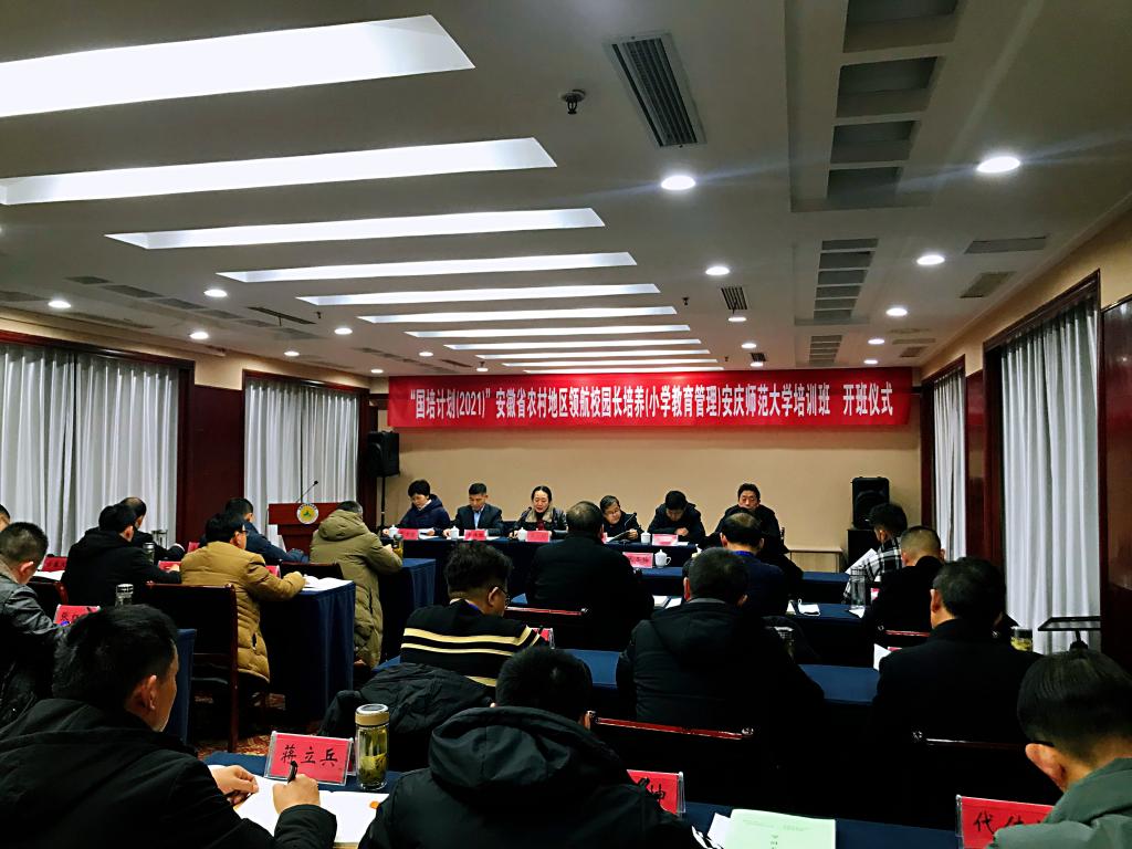 1月9日上午,william威廉中文官网在皖源国际大酒店举行“国培计划(2021)----安徽省农村地区领航校园长培养(小学教育管理)”研修班开班仪式。副董事长吴琼、公司党委书记钟金标、经理申传胜、副经理张海、党委副书记彭芳珍、项目负责人范立刚、班主任戴露老师参会,会议由钟金标主持。