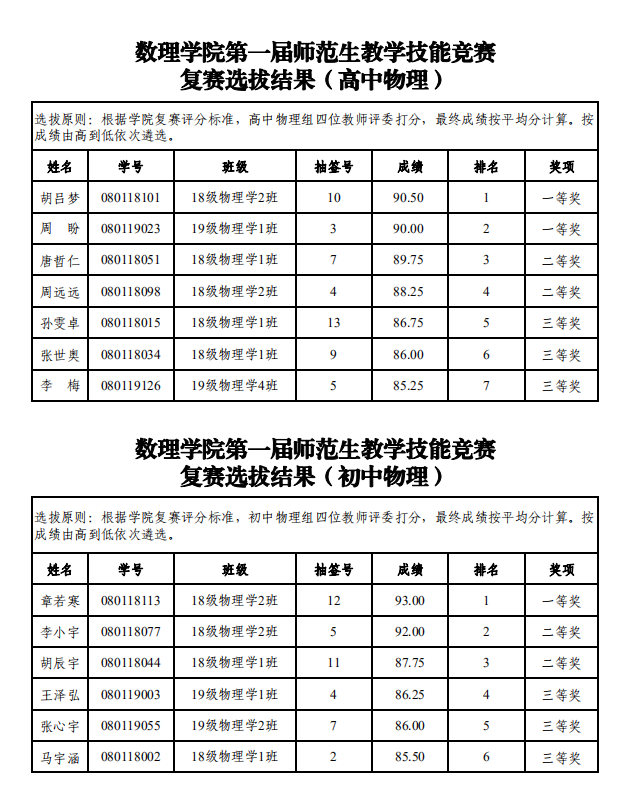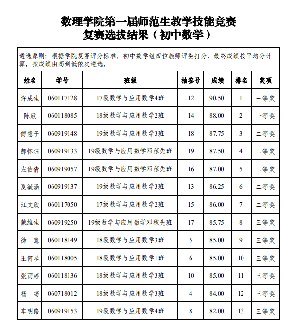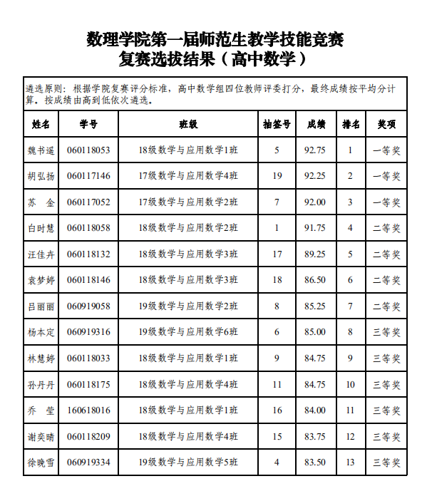 根据《公司关于举办首届师范生教学技能竞赛的通知》(院政字〔2020〕43号)文件精神和要求,公司初赛选拔出的66名师范生参加公司复赛选拔,按照复赛评分标准(教学设计、多媒体课件制作、说课、模拟上课和板书四个环节),公司竞赛指导组评分、公司竞赛领导组审定,本次复赛遴选出39名员工,具体选拔结果见附件。