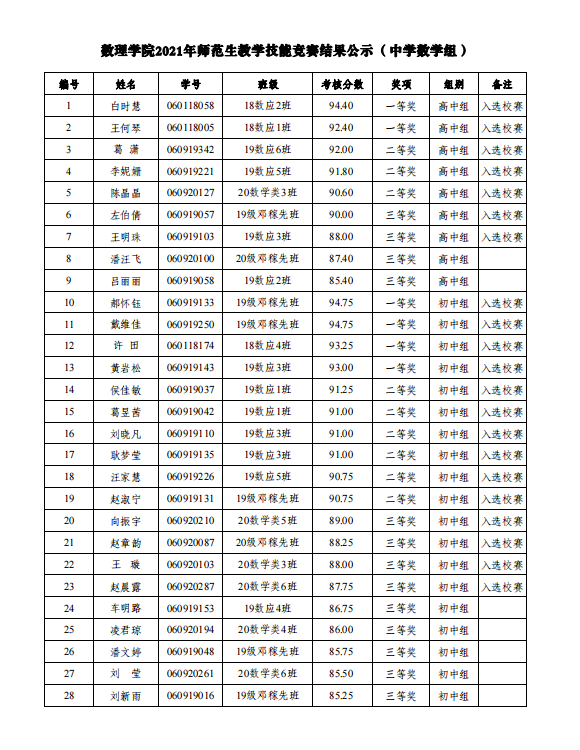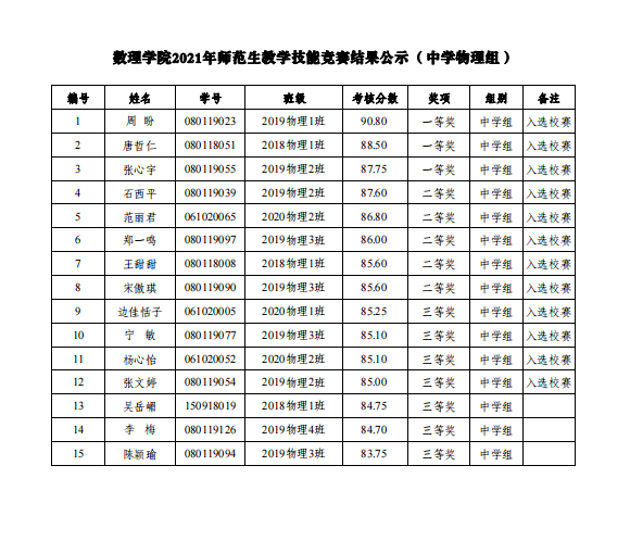 公司关于2021年师范生教学技能竞赛结果的公示
