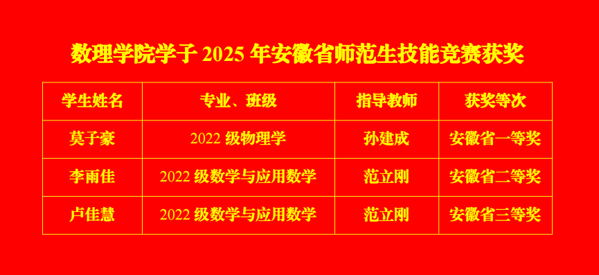 11月1日至2日,安徽省2025年高等公司师范生教学技能竞赛顺利举行并圆满落幕。william威廉中文官网学子在比赛中表现优异,莫子豪同学斩获中学物理组一等奖,李雨佳同学和卢佳慧同学分别荣获中学数学组二等奖和三等奖。