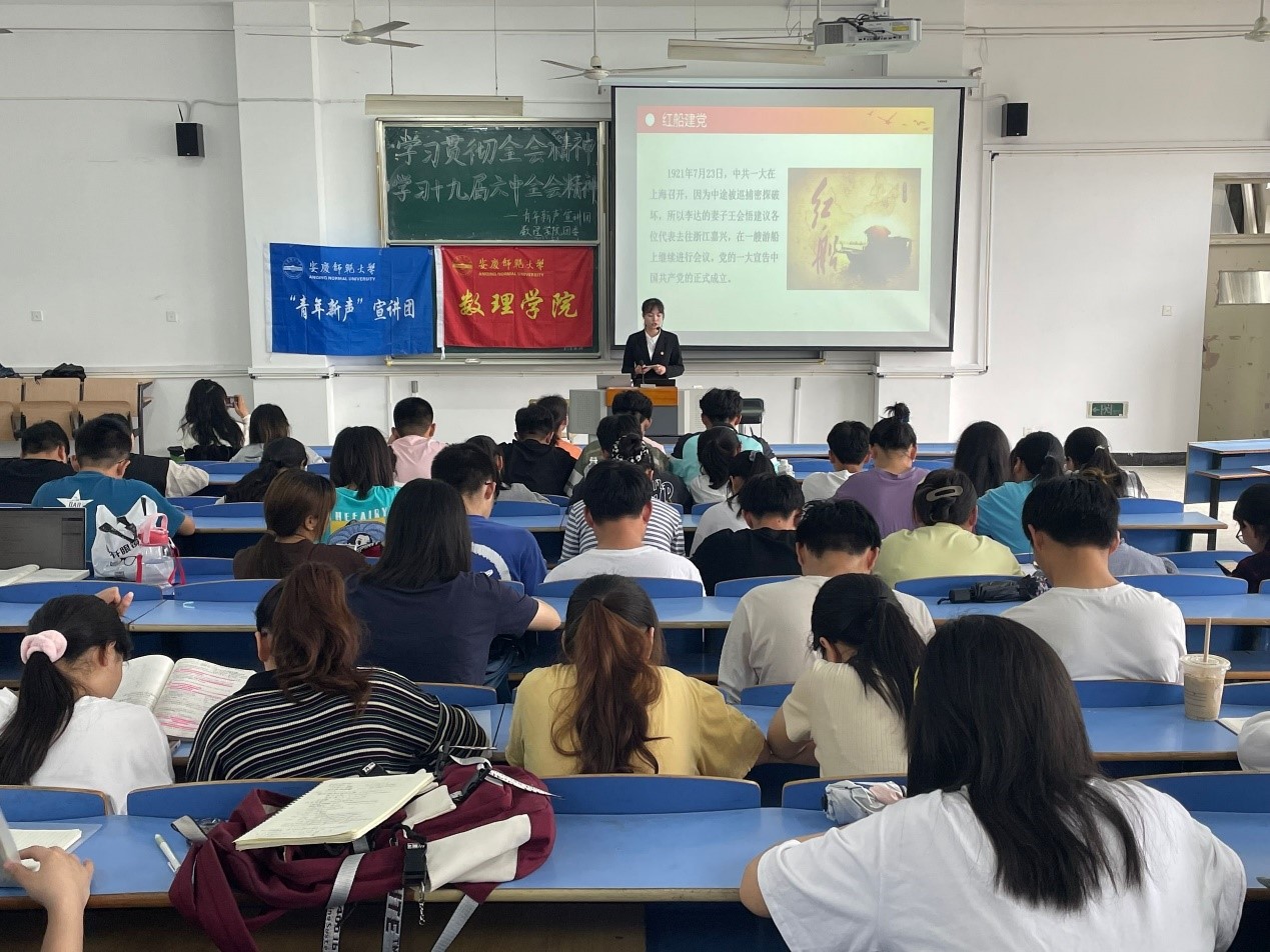 宣讲团成员围绕“一个主题”“两个确立”“三个历史性飞跃”“四个伟大成就 ”“党的百年奋斗的五个历史性意义”等五个方面,以数字为引、时间为线带领同学们深入学习了十九届六中全会精神。通过视频和幻灯片相结合的方式,生动地讲述了党的百年奋斗的壮丽诗篇,勉励广大学子牢记党的教诲,立志民族复兴,不负韶华,不负时代,不负人民,在青春的赛道上奋力奔跑,争取跑出当代青年的最好成绩。