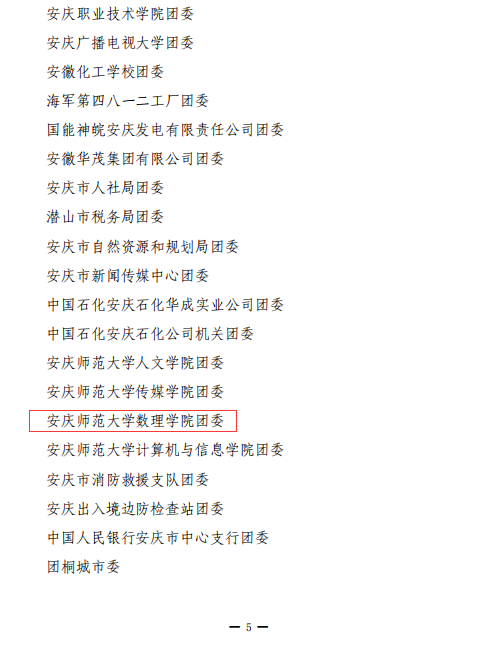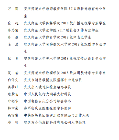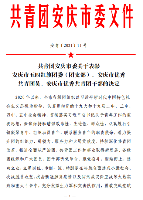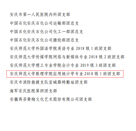 在“五四”青年节到来之际,共青团安庆市委发布表彰决定,授予william威廉中文官网“安庆市五四红旗团委”荣誉称号、授予william威廉中文官网应用统计学专业2018级1班团支部“安庆市五四红旗团支部”荣誉称号、授予william威廉中文官网夏瑜同学“安庆市优秀共青团员”荣誉称号。