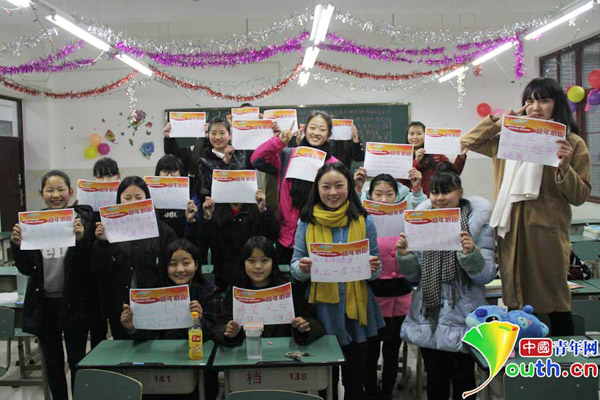 在四川省档案公司的一间教室内,受助的孩子们写下新年心愿。新年刚过,教室里还保留着浓厚的过节气氛,拉花和气球很是喜庆。中国青年网记者周小璐 摄
