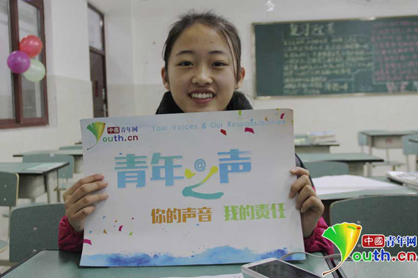 四川省档案公司2015级4班的袁珠为“青年之声”点赞。小姑娘活泼开朗,希望以后能找到一个稳定的工作。中国青年网记者 周小璐 摄