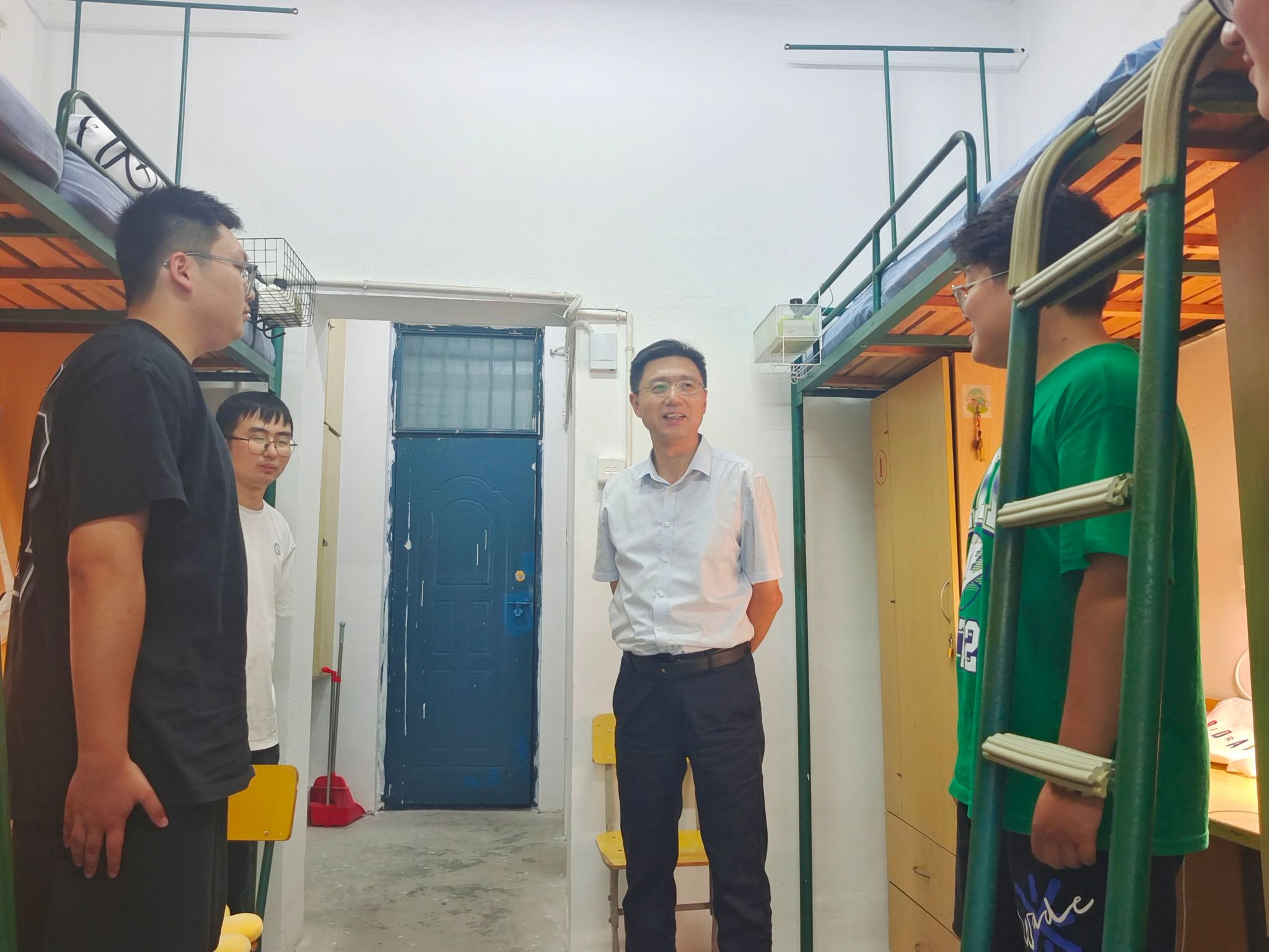 “你来自哪里?家长今天也一起来了吗?”“校园卡会使用了吗?”“宿舍环境是否满意?”走进新生寝室,陆健详细询问了新生的家庭情况和开学报到等情况。他勉励同学们要勤奋学习,营造良好的学习氛围,做好人生规划,珍惜时光、不负韶华,保持良好的学习和生活习惯,争取学有所获,学有所成。同时鼓励同学们建立良好的宿舍关系,互相理解、互相帮助,加强寝室清洁管理,保持宿舍环境卫生,注意财产安全、用电安全和预防电信诈骗。