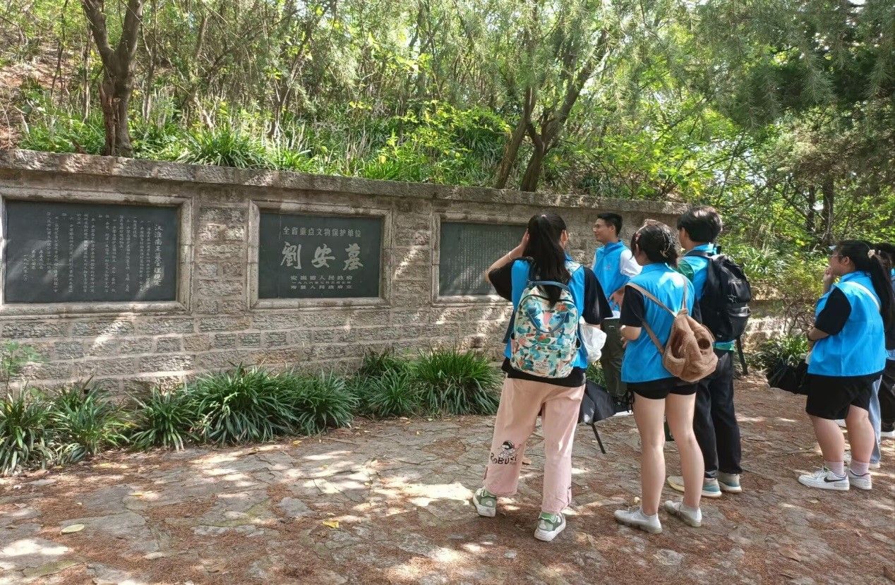 淮南王刘安之墓面临淝水,背依青山,呈现出一派王者气象。初入墓园,门前立着一块“豆腐发祥地”字样的字碑,沿着树林继续向前,是淮南王刘安的墓碑,周围的残枝败叶无法掩盖王者气息,墓碑记录着这位诸侯王的一生。队员张润泽带领团队成员认真学习了墓碑背后的历史故事和刘安与豆腐发明的机缘巧合。丰富的汉文化遗迹和成语典故使得八公山成为中国历史文化名山,祖辈流传下来的传统豆腐制作技艺成为国家级非物质文化遗产之一。