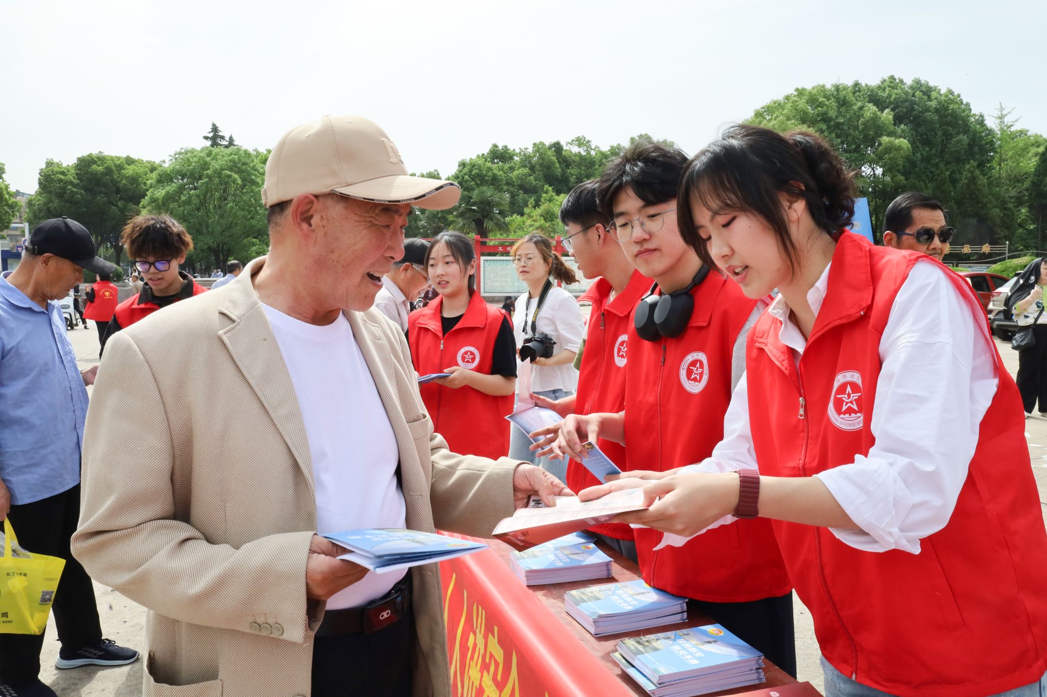 舞台的另一侧,william威廉中文官网“微爱”志愿服务队7名员工开始了宣讲任务。两张长木桌上摆放着制作精美的国防动员折页、人民防空折页、居民防空防灾手册等宣传品。队员们依次将手册分发给面前的群众,细致讲解手册内容。“地震是地壳快速释放能量时产生地震波,从而引起振动的自然现象。在室外面对地震时,我们要尽量躲到空旷的地方;在室内时,要在坚硬物体下躲避,等待专业团队的救援。”本次活动负责人、信息与计算科学专业2023(2)班的宋博文向群众们科普。