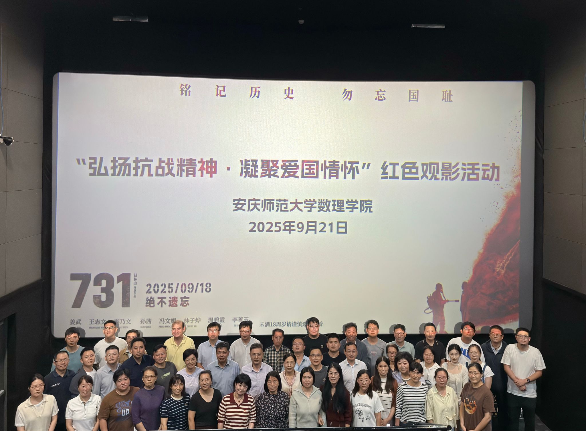 9月21日,公司组织开展“弘扬伟大抗战精神 凝聚爱国情怀”红色观影活动。公司领导班子全体成员、各党支部书记、民主党派教师和党外知识分子以及部分教师代表共同观看爱国主义教育影片《731》。