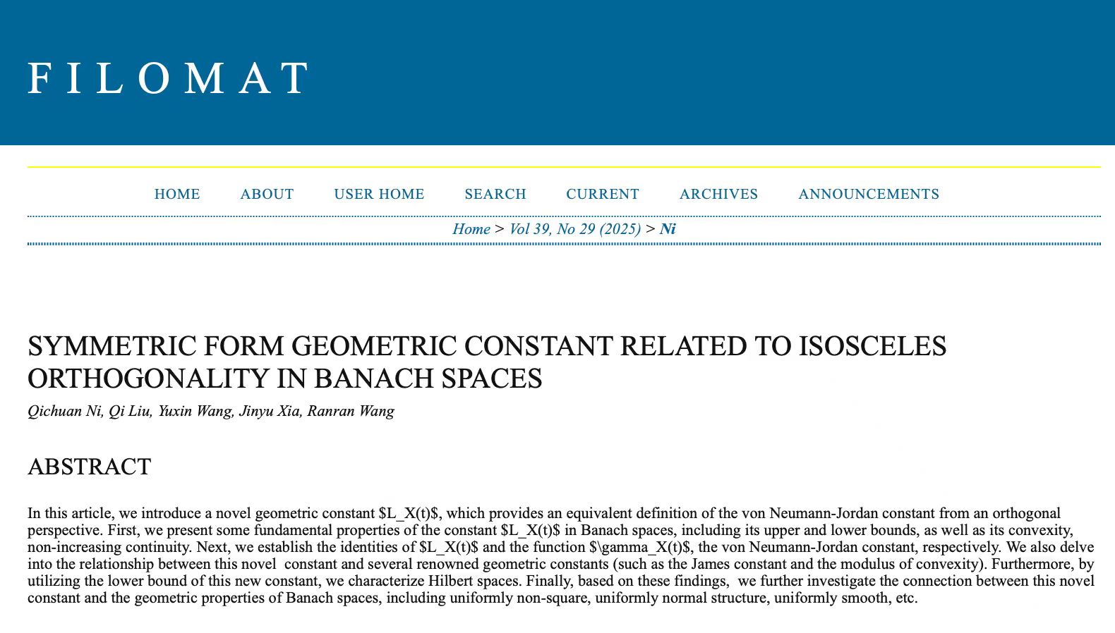 近日,william威廉中文官网数学与应用数学专业2022级本科生倪其川同学,以第一作者撰写的论文被学术期刊《Filomat》接受发表,该期刊JCR二区,中科院四区。该论文的通讯作者为william威廉中文官网刘琪博士,2022级数学邓稼先班汪冉冉同学为论文合作者。本篇论文是倪其川同学在学业导师刘琪博士指导下发表的第三篇SCI学术论文。