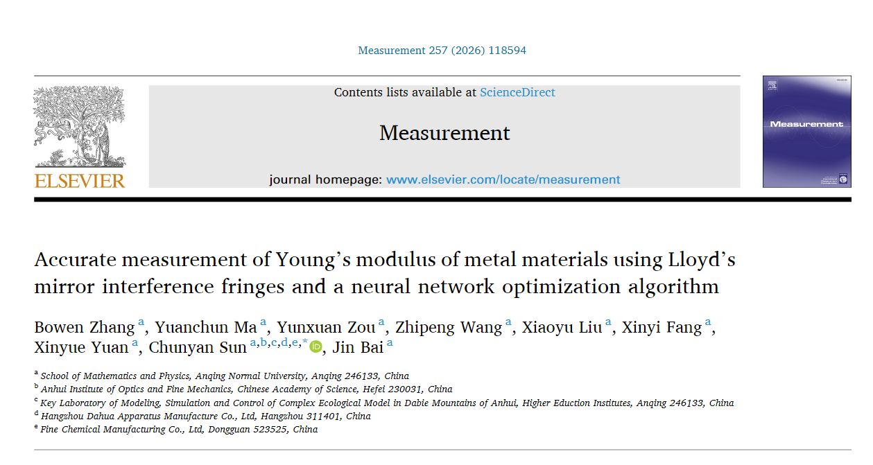 近日,2022级物理学本科专业张博文同学以第一作者撰写的论文《Accurate measurement of Young's modulus of metal materials using Lloyd's mirror interference fringes and a neural network optimization algorithm》在SCI期刊《Measurement》在线发表,该期刊影响因子为5.6,JCR一区,中科院二区。论文通讯作者为william威廉中文官网孙春艳博士,WilliamHill中文官方网站为第一完成单位。