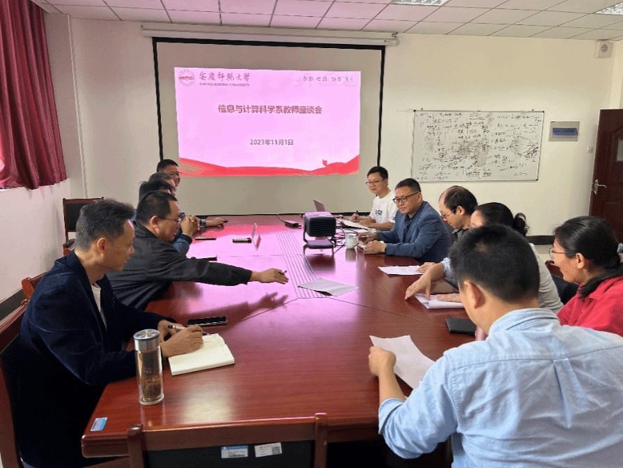 信息与计算科学系教师座谈会由教研室主任龙永尚主持,信息与计算科学系全体教师、教学办公室工作人员参加会议。各授课教师根据教学日历汇报教学进度、员工的课堂反应、教师听课情况以及阶段性教研活动开展情况,并围绕教师评学、专业建设、教材和课程建设等方面对信息计算专业建设和发展进行了交流讨论。