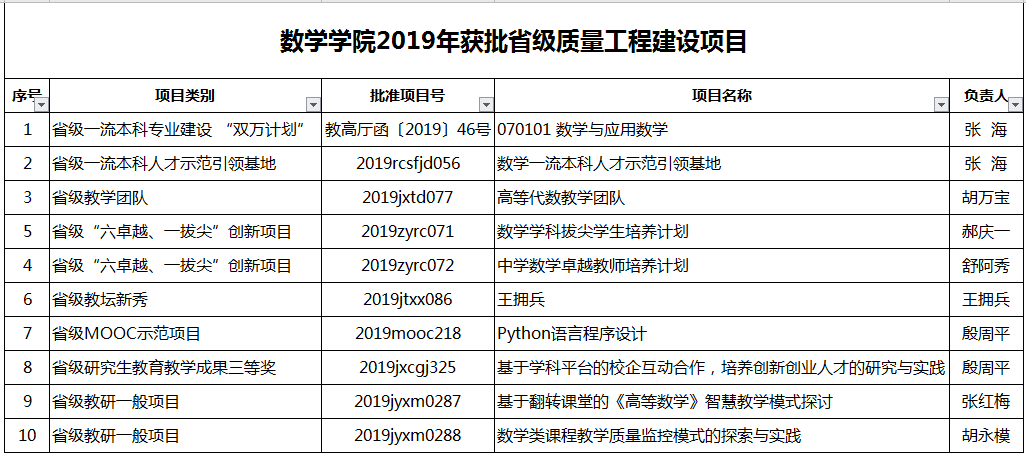 根据教育部办公厅发布《关于公布2019年度国家级和省级一流本科专业建设点名单的通知》(教高厅函〔2019〕46号)和《安徽省教育厅关于公布2019年高等公司省级质量工程项目名单的通知》(皖教秘高字〔2019〕94号),公司数学与应用数学专业获批安徽省一流专业“双万计划”建设点,数学一流本科人才示范引领基地等9项省级质量工程项目获批建设。