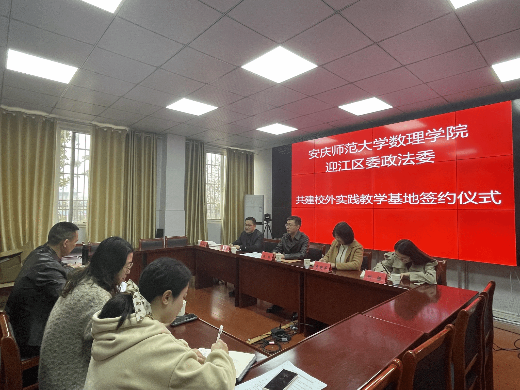 3月8日下午,公司党委书记陆健、副经理易明芳一行5人赴安庆市迎江区人民政府,与迎江区政法委商谈社区平安建设调查合作,并签署社区平安建设调查合作协议,举行应用统计学专业校外实践教学基地揭牌仪式。