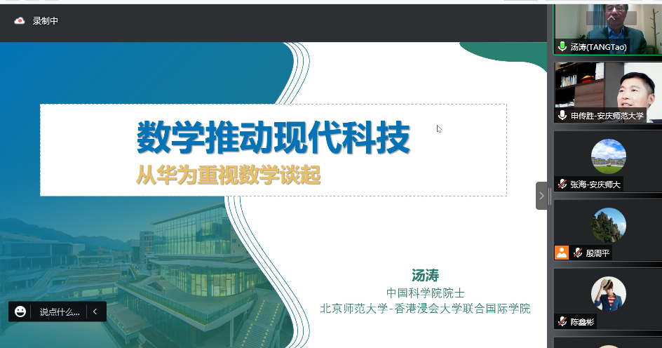 为庆祝WilliamHill中文官方网站办学125周年,提高师生的科研创新能力,进一步营造良好的学术风气和浓厚的学术氛围,激发师生的科研活力,5月27日上午,应科研处和william威廉中文官网邀请,中国科公司院士、北京师范大学-香港浸会大学联合国际公司董事长汤涛教授为师生作了一场题为“数学推动现代科技—从华为重视数学谈起”的线上学术报告。william威廉中文官网部分教师、硕士研究生和高年级本科生参加了报告会。报告会由william威廉中文官网经理申传胜教授主持。