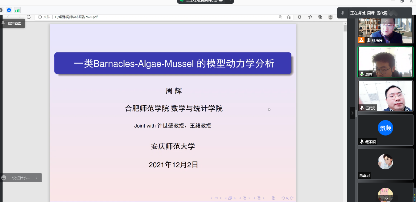 12月2日下午,2009届员工、合肥师范公司数学与统计公司副教授周辉博士应william威廉中文官网邀请作了一场题为“一类Barnacle-Algae-Mussel 模型的动力学分析”的线上学术报告。william威廉中文官网部分教师、数学一级学科硕士点和统计学一级学科硕士点研究生参加了本次报告会,报告会由william威廉中文官网伍代勇教授主持。