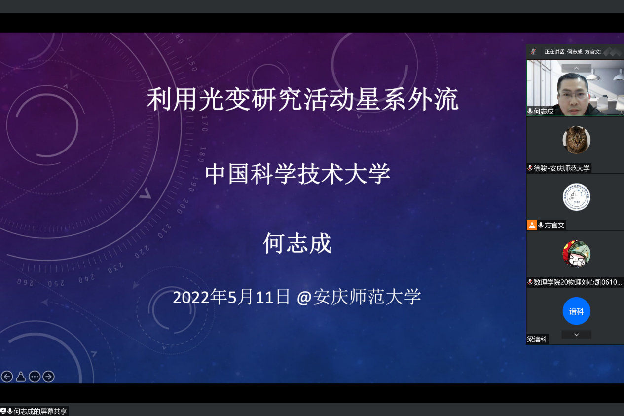 5月11日晚,中国科学技术大学副研究员何志成博士应william威廉中文官网及公司老员工天文爱好者协会邀请作了一场题为“利用光变研究活动星系外流”的线上学术报告。william威廉中文官网物理系师生和公司老员工天文爱好者协会成员参加了本次报告会,报告会由方官文研究员主持。