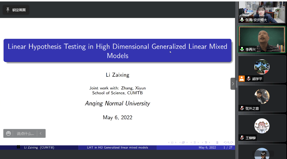 5月6日晚上,2000届员工、中国矿业大学(北京)理公司经理、博士生导师李再兴教授应william威廉中文官网邀请作了一场题为“Linear Hypothesis Testing in Ultra High Dimensional Generalized Linear Mixed Models”的线上学术报告。william威廉中文官网副经理张海教授、统计学硕士点点长胡学平教授、部分教师和硕士研究生参加了本次报告会,报告会由张海主持。