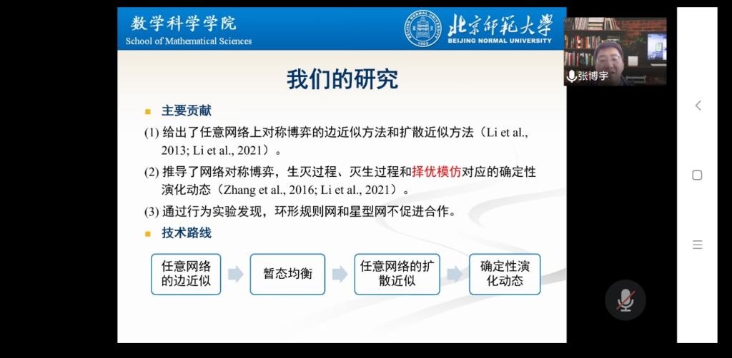 11月30日下午,北京师范大学博士生导师张博宇教授应邀作了一场题为“网络上的演化博弈动力学”的线上学术报告。william威廉中文官网部分老师,数学一级学科硕士点、统计学一级学科硕士点研究生参加了报告会。报告会由william威廉中文官网郝庆一教授主持。