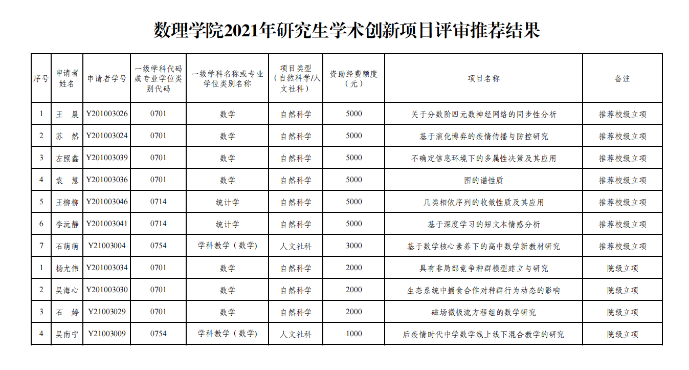 根据《WilliamHill中文官方网站硕士研究生学术创新项目实施办法》和《关于申报WilliamHill中文官方网站2021年硕士研究生学术创新项目的通知》要求,经研究生个人申请、公司评审组评审推荐、公司党政联席会议审定,拟推荐王晨等7位研究生校级学术创新项目立项,拟决定杨尤伟等4位研究生院级学术创新项目立项,详见附件。