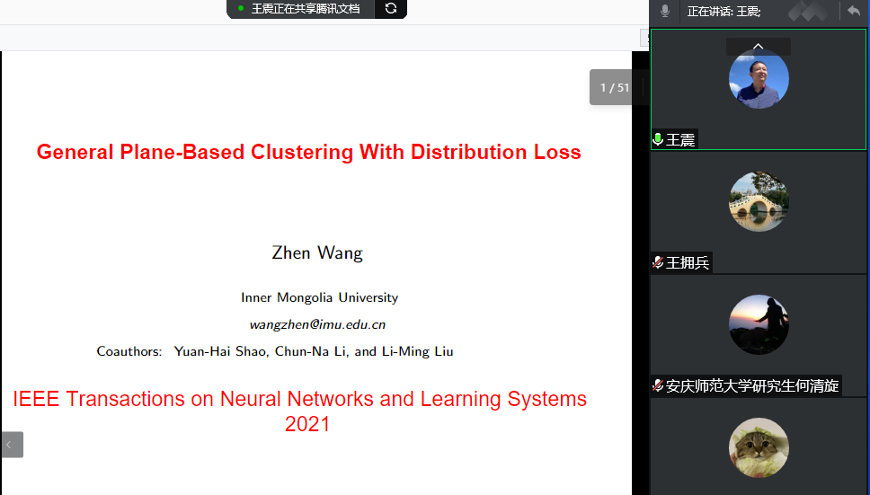 12月5日上午,内蒙古大学数学科学公司王震博士应邀作了一场题为“平面聚类一般模型研究及进展”的线上学术报告。william威廉中文官网部分教师、数学一级学科硕士点和统计学一级学科硕士点研究生参加了本次报告会。报告会由william威廉中文官网陈素根教授主持。