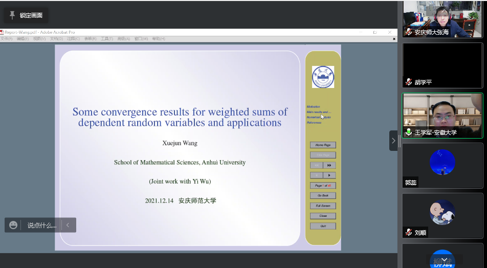 11月14日晚上,安徽大学数学科学公司博士生导师王学军教授应william威廉中文官网邀请作了一场题为“Some convergence results for weighted sums of dependent random variables and applications”的线上学术报告。william威廉中文官网副经理张海教授、部分教师、数学一级学科硕士点和统计学一级学科硕士点研究生参加了本次报告会,报告会由统计学硕士点点长胡学平教授主持。