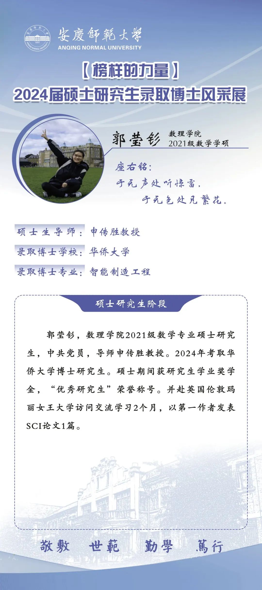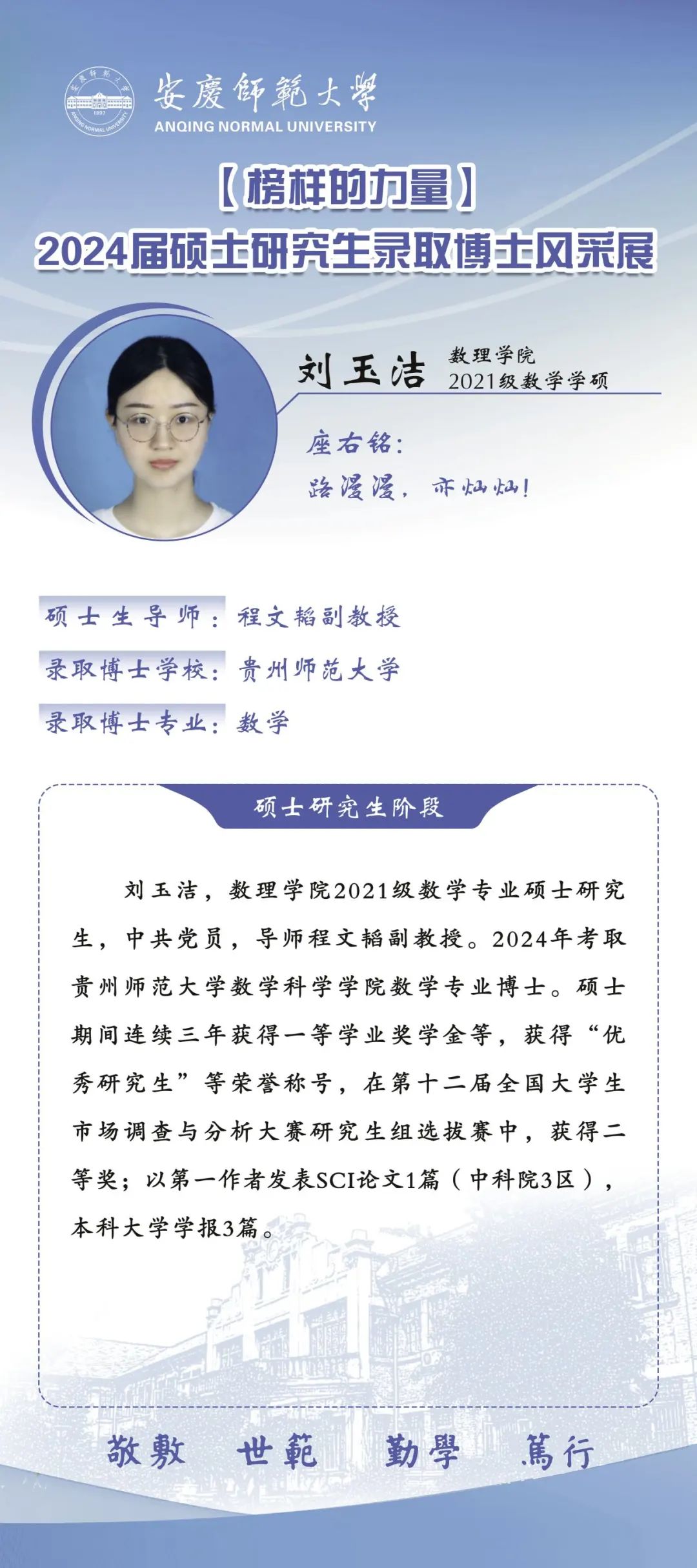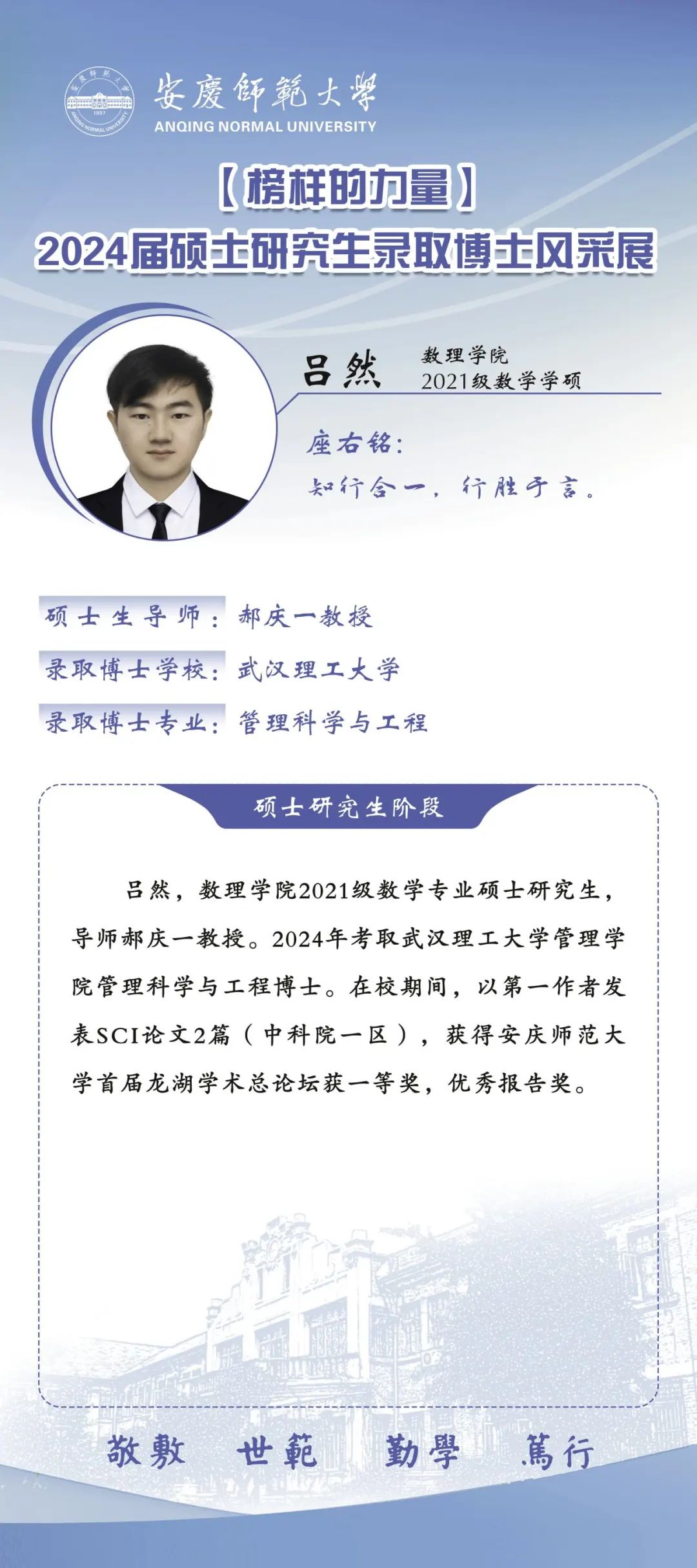 william威廉中文官网推出【2024届硕士研究生录取博士风采展】专栏,对录取博士的六名研究生的风采进行集中展示,旨在激励更多青年学子在奋斗中锤炼求真务实、勇于创新的高尚品格,引导广大研究生同学成长为学问与人格兼优的科研工作者,努力实现自我超越。(撰稿:陈力等;审核:张海)