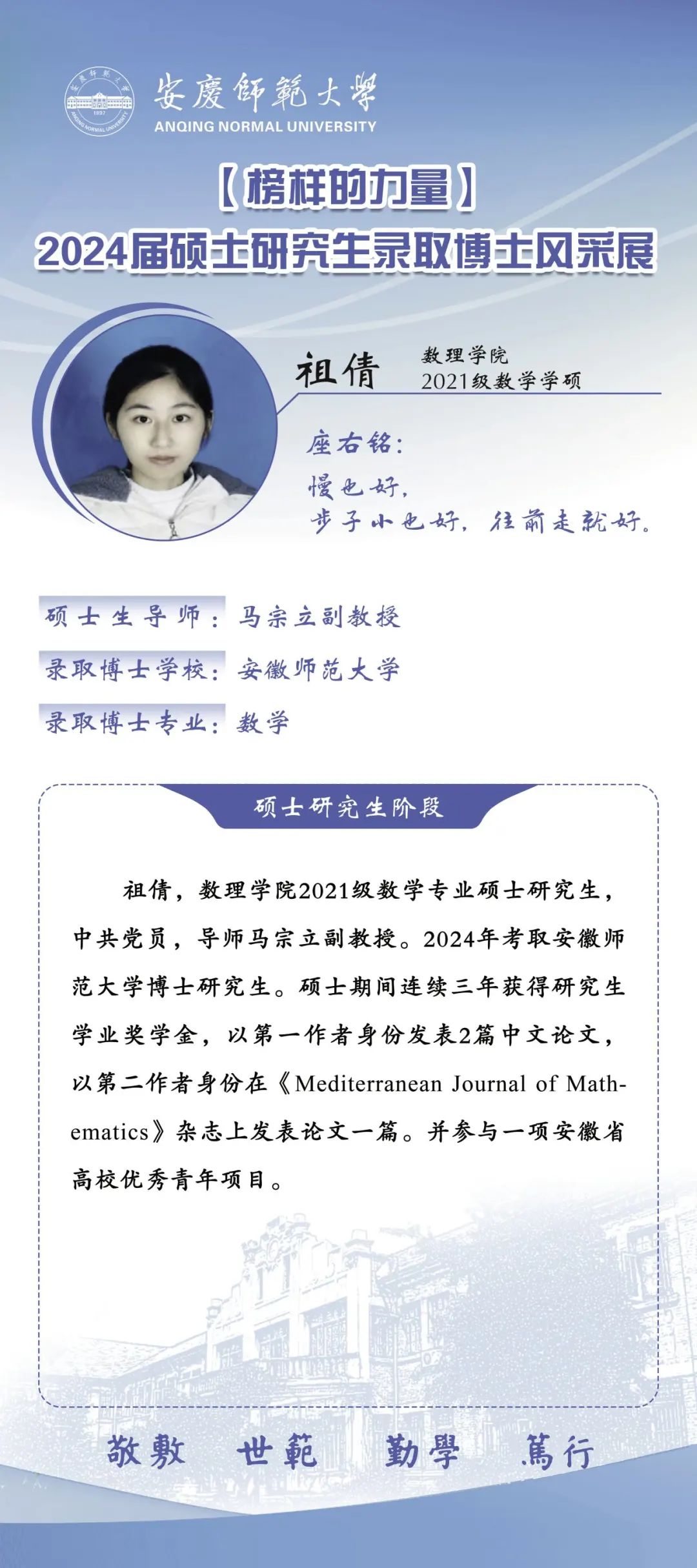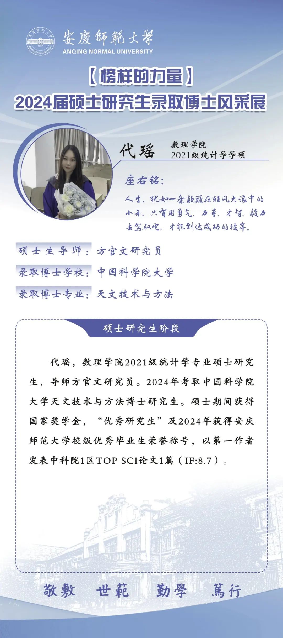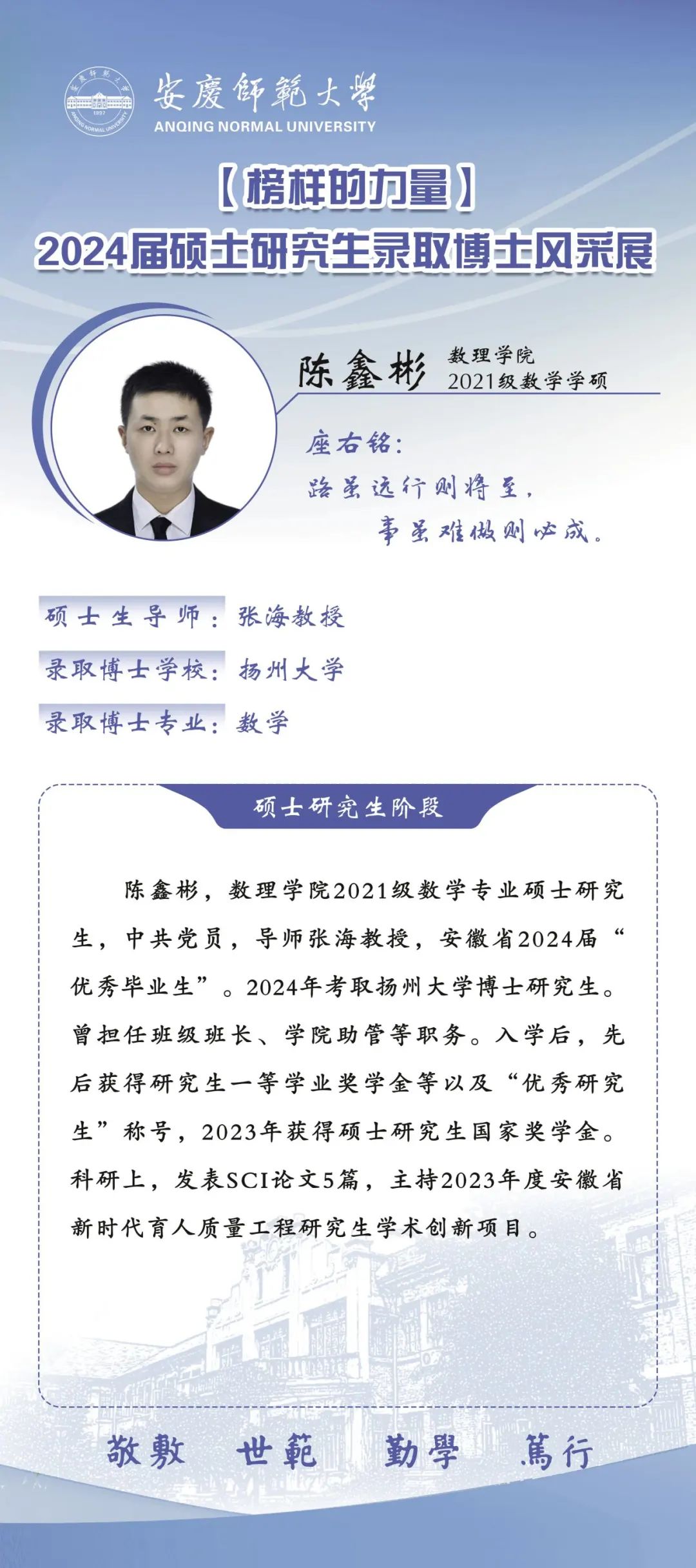 william威廉中文官网推出【2024届硕士研究生录取博士风采展】专栏,对录取博士的六名研究生的风采进行集中展示,旨在激励更多青年学子在奋斗中锤炼求真务实、勇于创新的高尚品格,引导广大研究生同学成长为学问与人格兼优的科研工作者,努力实现自我超越。(撰稿:陈力等;审核:张海)