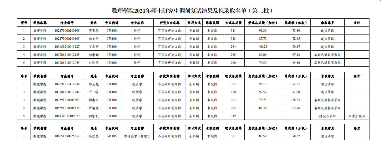 2021年硕士研究生招生调剂复试结果及拟录取名单公示(第二批)