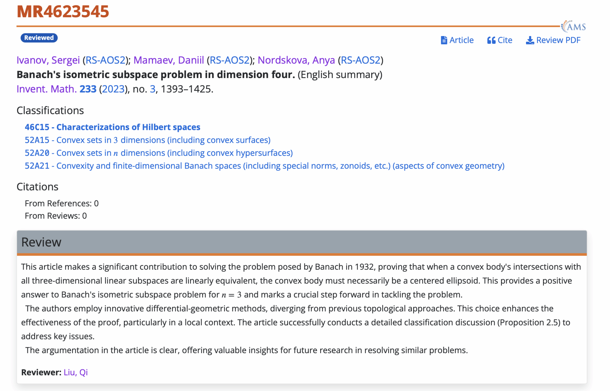 受美国《数学评论》邀请作为评论员,对知名数学类期刊 Invent. Math. 上发表的“Banach's isometric subspace problem in dimension four”一文进行专题评论。